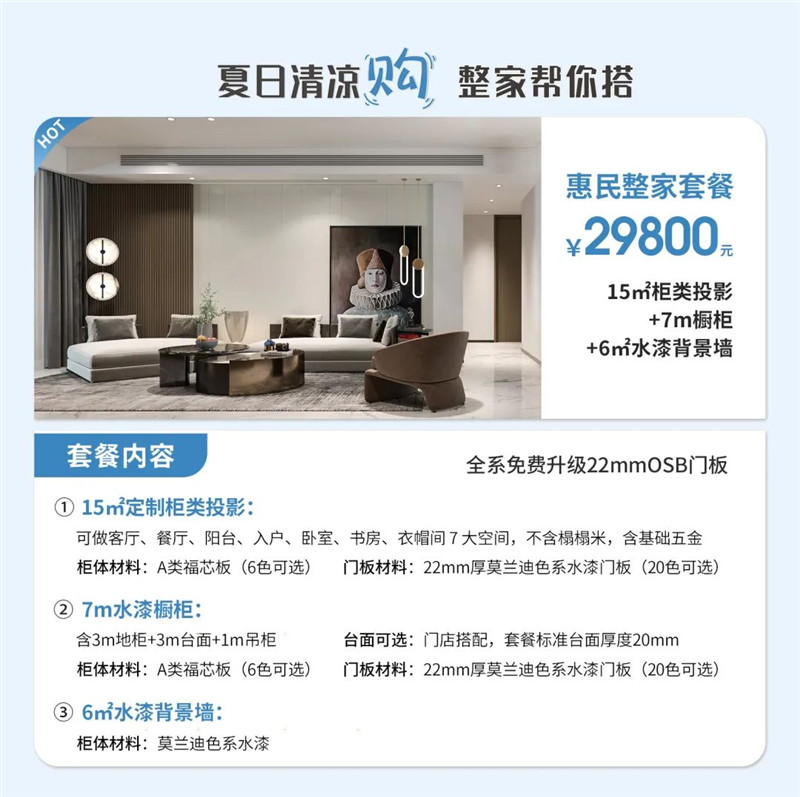 2023年6月30日-8月20日,365WMSPORTS年中大促带来惠民整家套餐¥29800,甄选水漆福芯板并严格遵守国家环保等级标准,打造高性价比的健康环保整家。