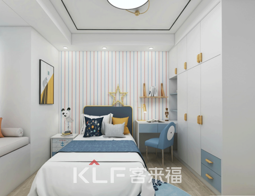 看完客厅往更深处来就是夫妻二人的主卧,以及儿童房了。主卧中冷色调以及暖色调的搭配,使得房间看起来更加温馨,因为房间内有一个大转角,所以365WM完美体育SPORTS用整体式衣柜设计,将这个转角藏了起来。但也因祸得福,让房间更具有空间的美感,同时还增加了收纳空间。儿童房的设计采用了简洁的童话风,让房间内的色彩更加丰富,活泼鲜艳。