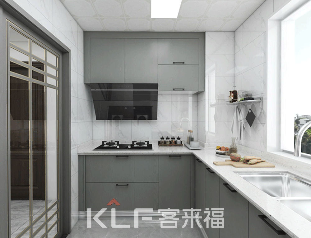 该户型的点睛之处在于对于厨房的设计,厨房的整体色调清爽明快。更宽阔的操作空间,任你“施展拳脚”,地柜与吊柜配合默契,做饭时调料放取收纳得心应手,一人掌勺,一人打下手,烟火气息都能温暖对方的心。