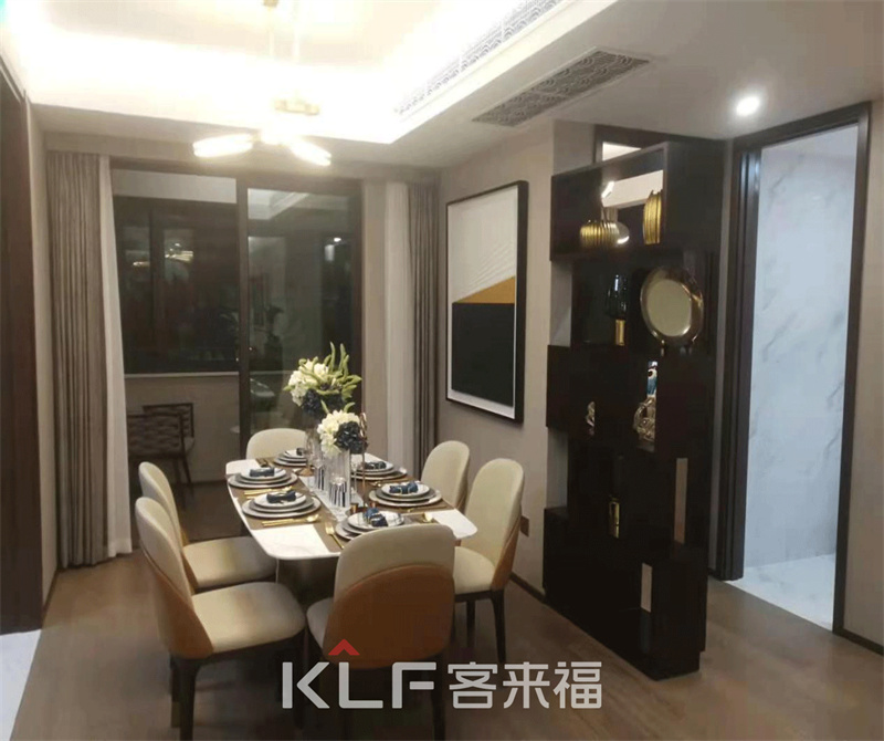 走过客厅,转身就来到了餐厅空间,柔软布料搭配木质框架,营造典雅奢华的餐厅环境,在暖阳如火的灯光映射下,食物仿佛镀上了一层朦胧的金。餐边柜的设计充分考虑到女主人的收纳要求。