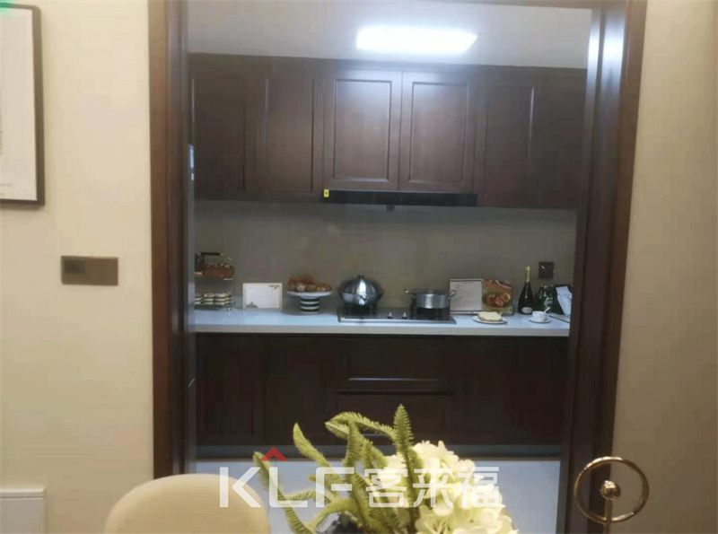 靠近餐厅一旁就是充满烟火气息之地,宽U型构造,让厨房更大,空间宽广的同时,动线设计合理,依据女主人的身高量身打造的橱柜,让做放拿取都简便自如。深色系和白色搭配,让操作台更显明亮。