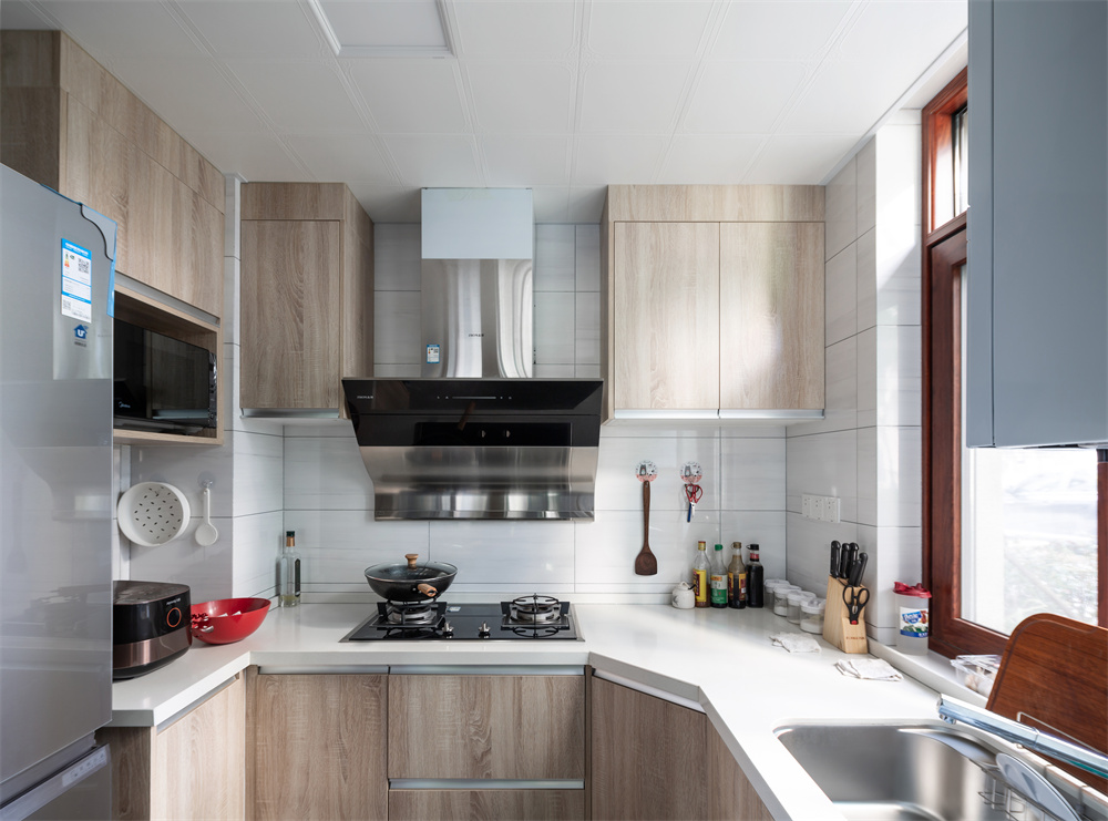 厨房:整体采用了U型的空间设计顶部木色柜体的设计,充分利用油烟机两旁的空间,便于放置一些家用电器、餐盘、榨汁机等物品。