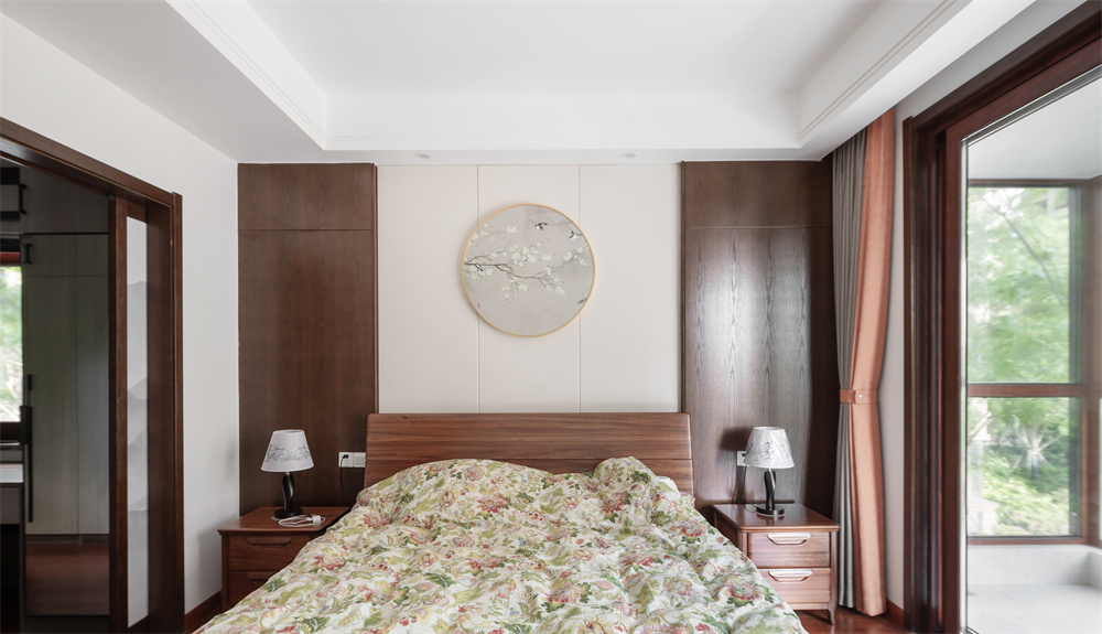 主卧处背景与床单的花纹配色透露出一股春天的和煦美好。背景墙上的重视挂画,蜿蜒生长的枝条,成群飞翔的燕子展现出自然的生机。右侧带了一个阳台,外面枝叶茂盛,树叶摇动,卧室被绿意包围。