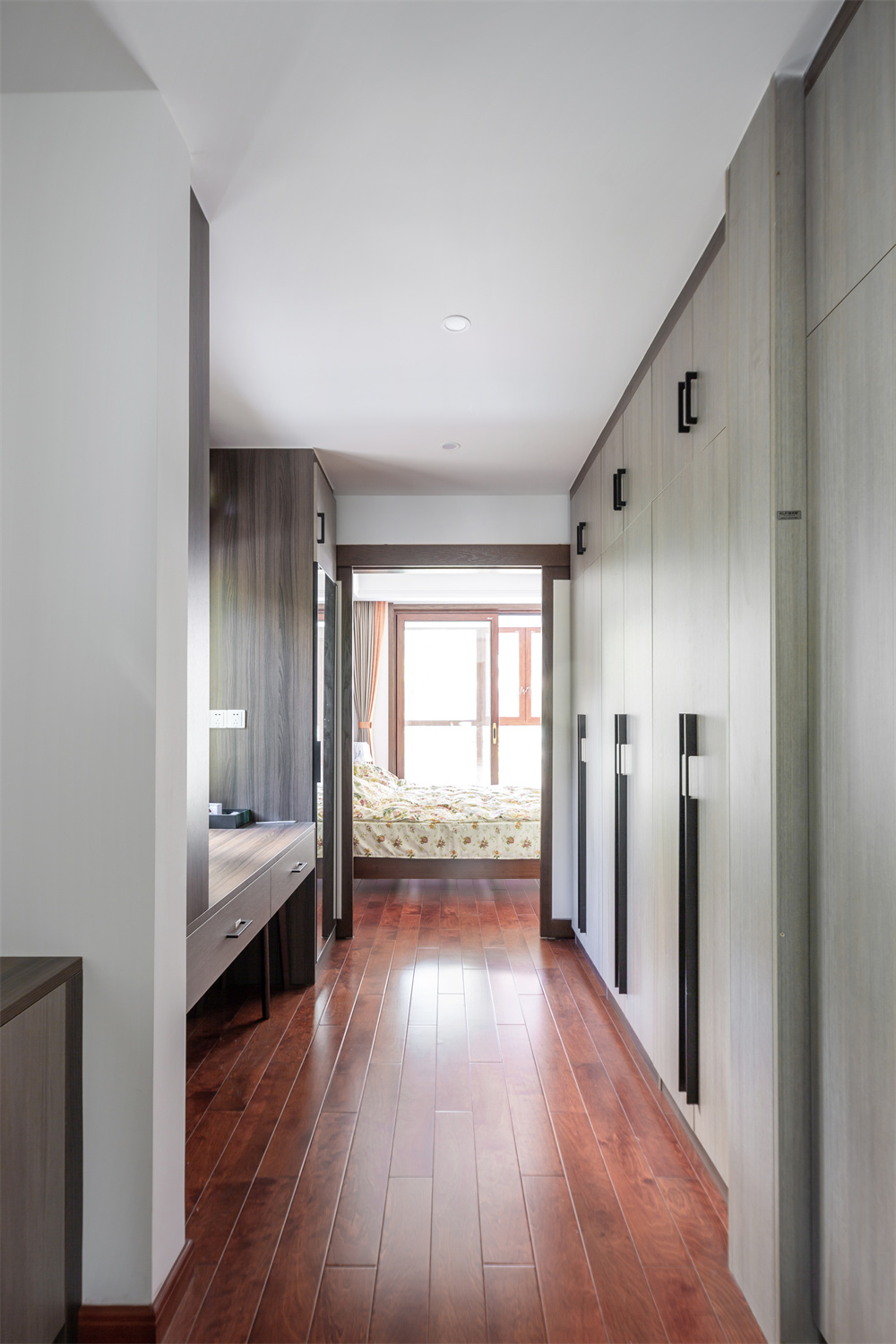 走廊虽然与主卧相连接,但是卧室处中间采用推拉门的设计,关上就是两个各自独立的空间。走廊处整面到顶的衣柜,可以当做整体的衣帽间来使用,收纳衣物的能力很强。
