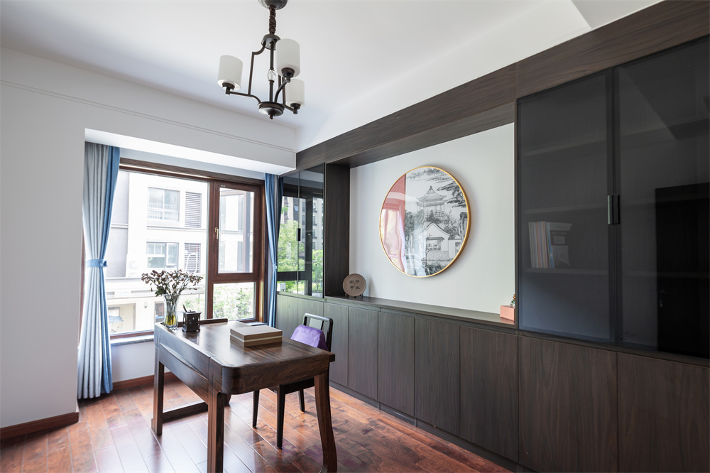 书房是屋主特地为爱人准备,便于爱人日常办公的需求,特地选取了一间风景优美的房间作为工作区域。仿佛如黄鹤楼般的装饰画,处处透露出浓郁的中式风。茶色的玻璃柜可以映照出窗外的景色,在这里办公非常安静,可以集中精力思考处理事务。