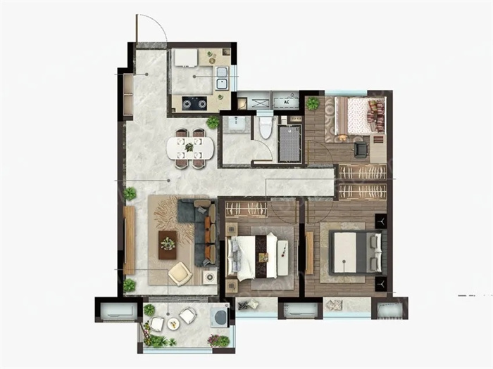 本次户型属于三室两厅的构造,从玄关处进入便是客厅和餐厅,厨房位于餐厅的一侧。往里走去便是走廊,走廊两侧分布着卧室和卫生间,整体构造清晰,格局分布透彻。