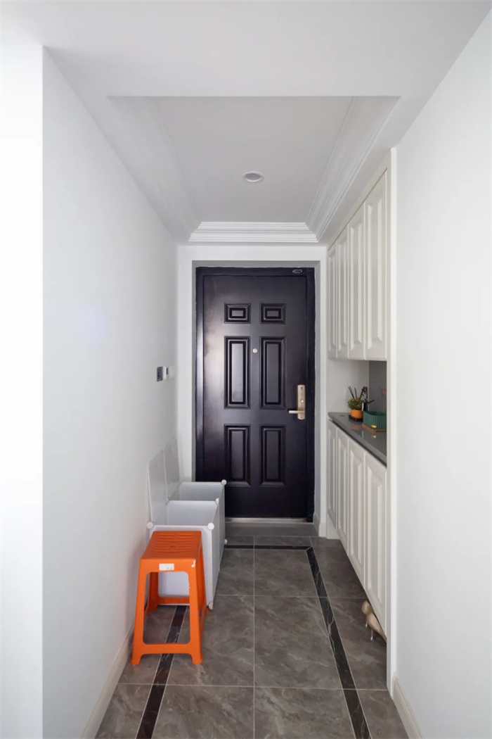 打开家门玄关是第一眼便能看到的,嵌入式玄关平行于墙面,十分平整不占据额外的空间。玄关整体是芬兰白的墙面,玄关柜们使用膜压门板,打磨的深度和形状流畅。户主在上方放了一些杂物,中间做了镂空台面,平时放钥匙扣、快递、雨伞都很方便。下雨平常出门着急,将鞋子放进下方空间中,省心又不会让家里看起来太乱。
