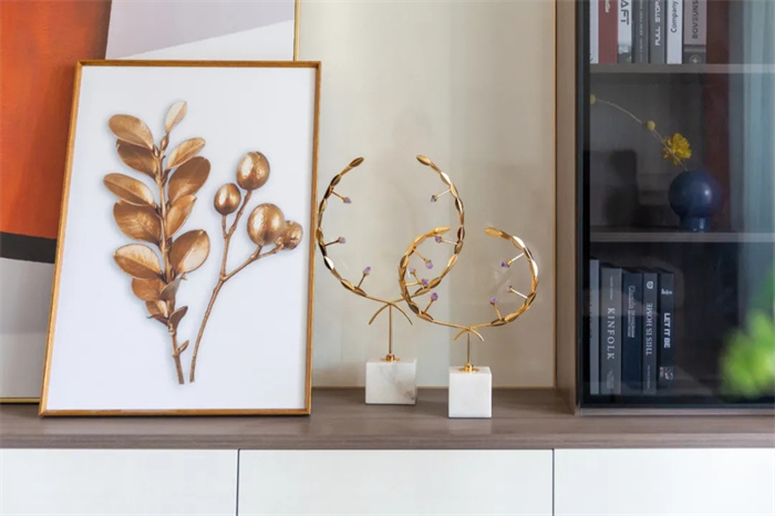 因为电视机未到所有在电视柜上方摆上挂画以装饰。电视柜上方两侧对称分布着书柜,日常放放书和奖杯奖状。考虑到电视柜长度和宽度的问题,如果只放电视机会有些空荡,书柜的打造提供收纳功能,也让整体更加饱满。