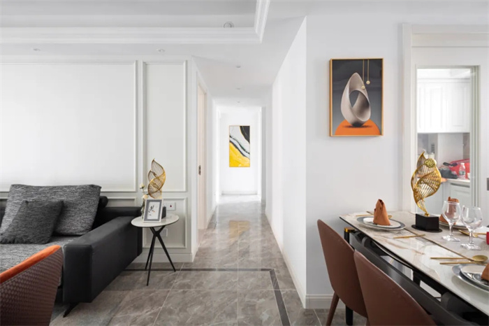 灰色皮质沙发一眼望去便能感受柔软的触感,白色的茶几下方铺上地毯,给轻奢增加一丝不寻常的味道,冬天可以把地毯抽出去孩子在上面玩耍,但是记得要及时打理。
