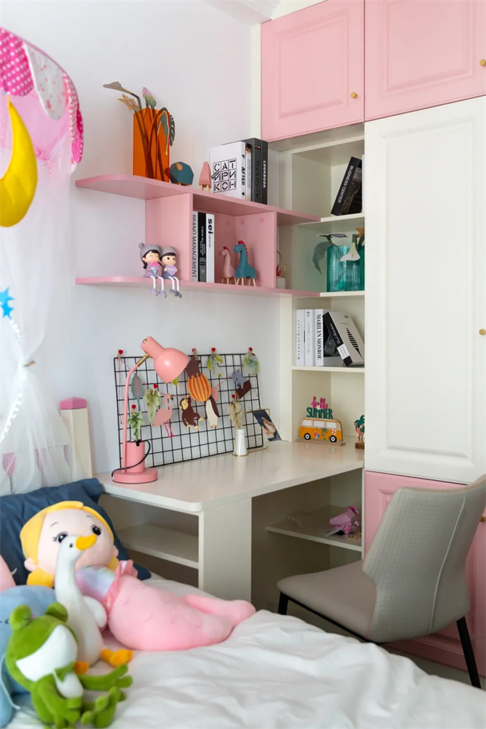 想要与清晨撞个满怀,从柔软的床铺上醒来,拥有一个安稳的家是梦终于实现的那天。户主在房屋装修前,对于房屋的风格比较倾向于轻奢和简约风格,希望设计师可以将两种风格共同融入房间内。户主家里有个小女儿,对她甚是喜爱,根据孩子成长特点和颜色喜好进行设计。