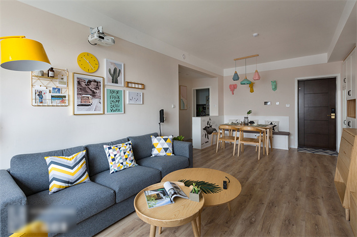 为了迎合屋主对于自然气息的热爱,在地面和家具的处理上不难看出使用了大面积的原木色。两个大小不一、高度不同的茶几拼凑出时尚,亮黄色的灯具在驼色墙面的衬托下显色尤为出彩。或许,这才是家的正确打开方式......