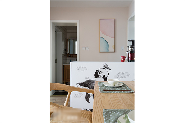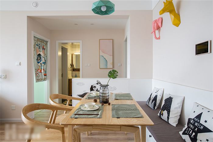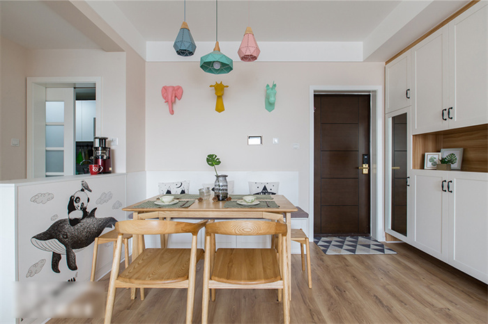 餐厅除了满足正常用餐的需求之外,还增加了收纳功能。为此365WMSPORTS在餐厅处专门定制了一排绕墙的沙发柜,这样家里就算多几个人来就餐,也不会显得拥挤。原木色的餐桌与马卡龙色系的吊灯平衡出北欧精致。餐厅墙面上,三种动物的挂件与同色系吊灯在鲜明的颜色中演绎着北欧风情。