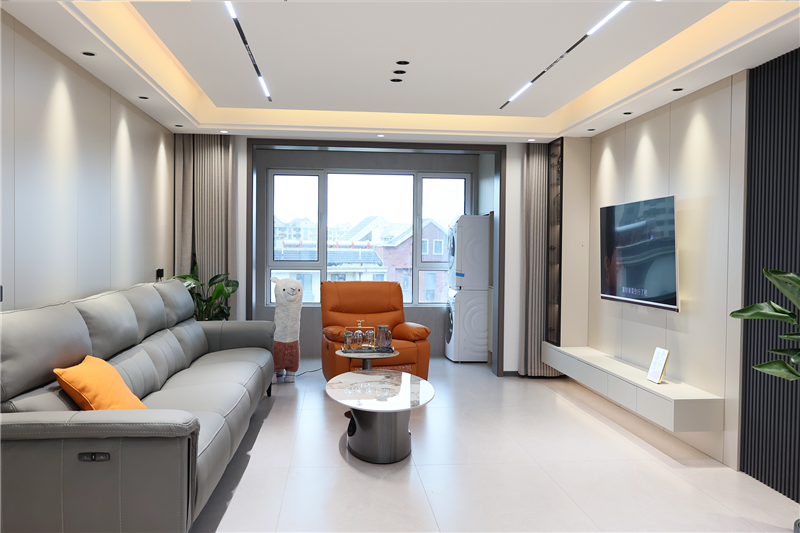 沙发水漆背景墙与电视背景墙相呼应,茶白色调尽显温柔;电视整面墙板配合格栅、侧边柜,错落有致;底柜做抬高处理,可以躺平看电视,还方便清洁。