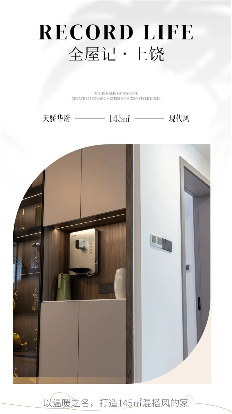 餐边柜留出冰箱位置做一体化设计,中部做半透茶玻用于展示藏酒与摆件,侧边柜中部掏空做置物台可以放置小家电和生活物品。整体餐边柜的设计功能性很高,在实用的同时注重各分区的比例,给人更精致的感觉。