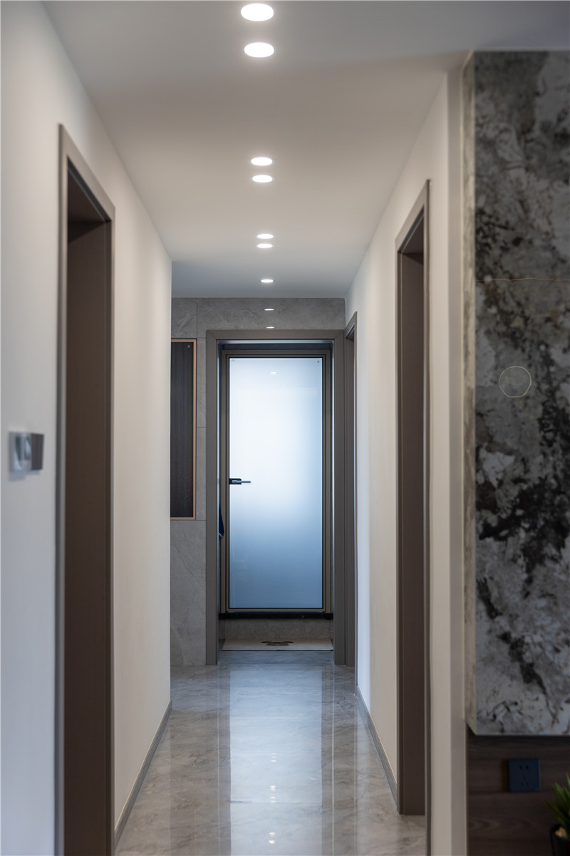 在这户案例中,收纳需求和居住的舒适性是屋主所追求的。所以在阳台空间上,屋主与设计师也通过两组柜子让家变得更干净。一侧做家政柜嵌入洗烘家电,到顶高柜内部分区合理,很实用。