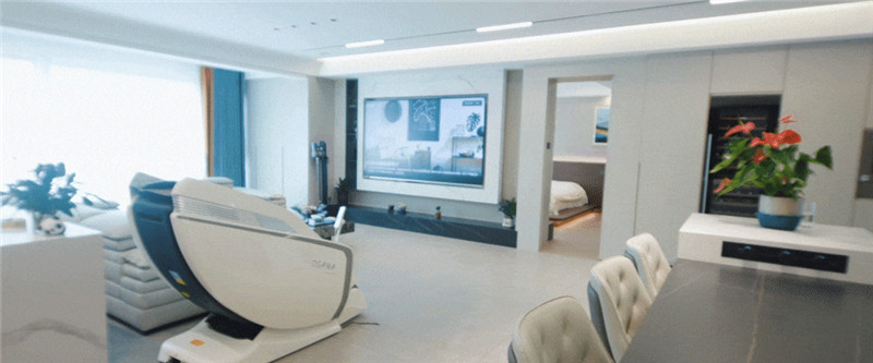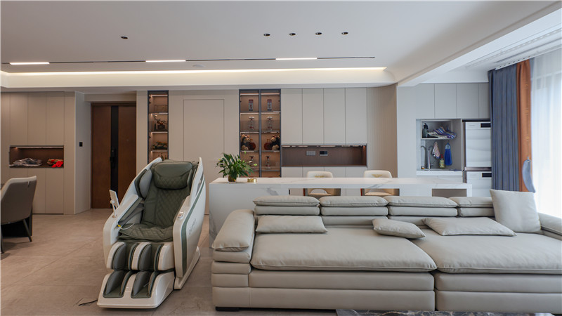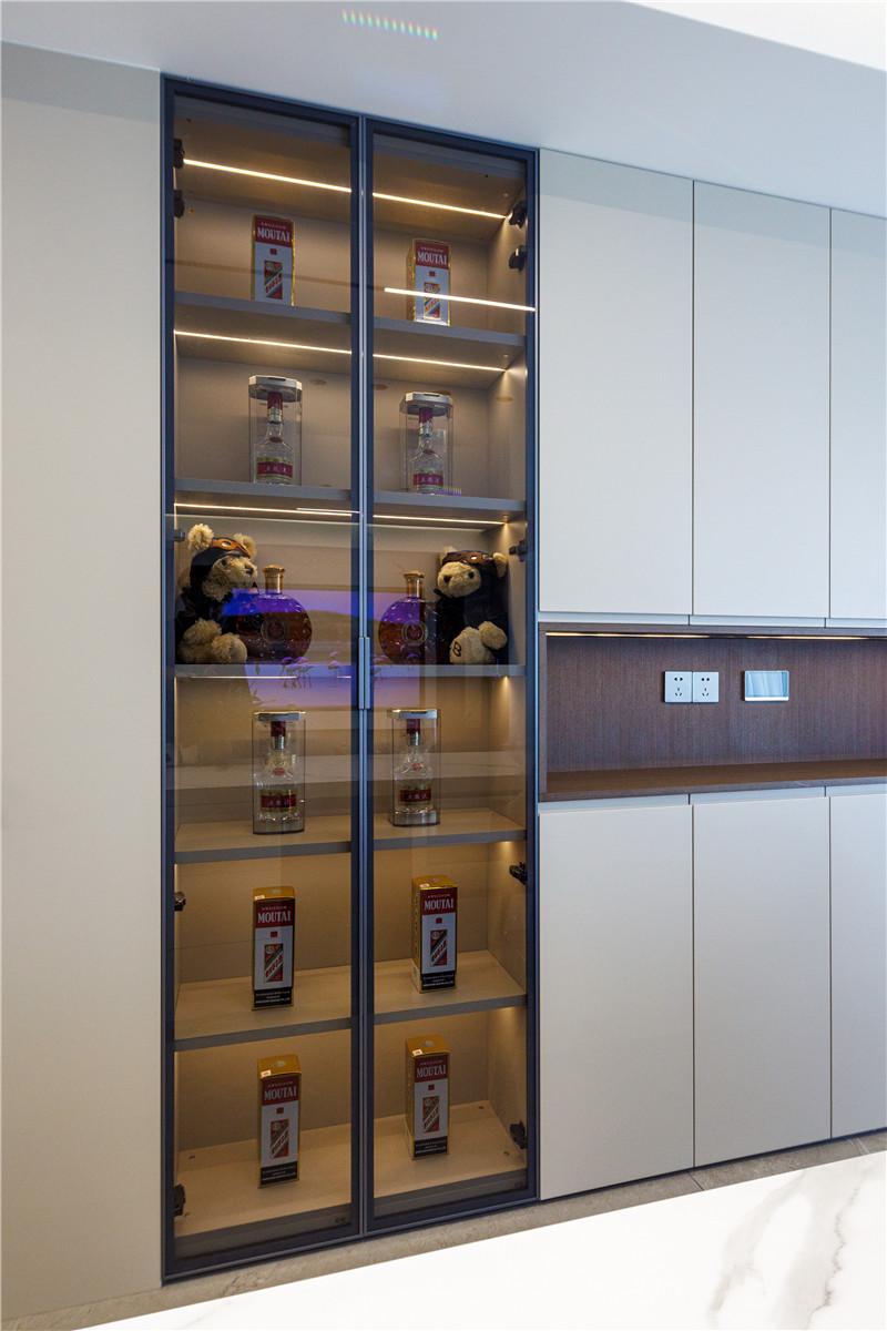 在沙发背景一侧,365WM完美体育SPORTS用一组岛台与餐桌的设计形成空间上的划分,沿着墙壁走势设计的酒柜与次卧门齐平,这样整体做嵌入式的柜体收纳会让空间显得更轻盈。半透茶色玻璃柜门也很好地展示了藏酒与工艺品,彰显屋主的生活格调。
