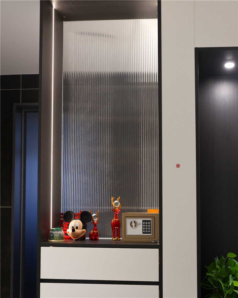 此玄关柜也充当隔断的作用,整面白玻配合型材拐弯,若隐若现感让人眼前一亮。