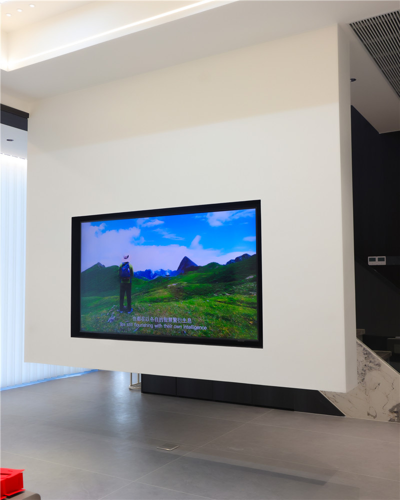 电视背景墙整体挑高处理,内嵌电视机,“躺平”式观剧一整个爽住,还方便卫生清理;沙发背景墙做圆弧造型颇富艺术感,配以灯光的运用,氛围感跃于空间。