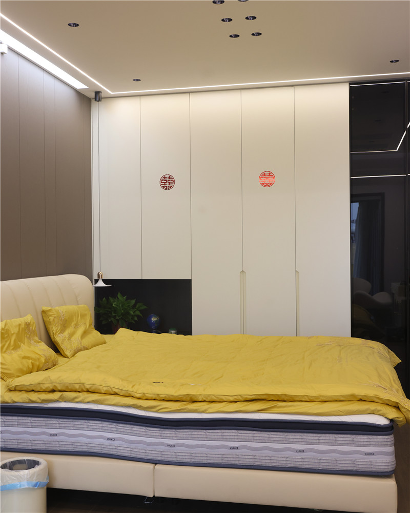 卧室一侧整面立柜,配合铣槽拉手简约利落;梳妆台抬高设计,融入圆弧造型,典雅温柔;整体空间主灯与辅灯相结合式设计,空间层次感强。