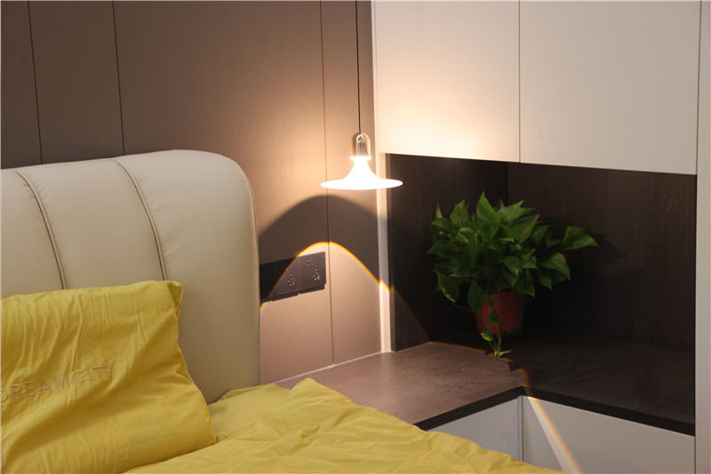 床头背景墙加入格栅设计,增强设计感;床头柜弧形收边,配合以小吊灯,氛围感满满。