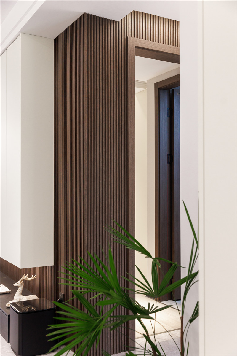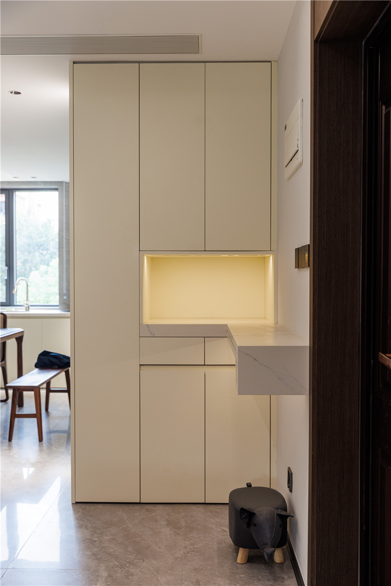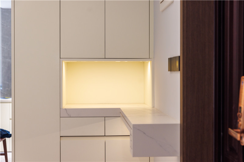 在玄关为了提升空间利用率,365WM完美体育SPORTS采用了嵌入式的柜体进行上下分区收纳。中部掏空后延伸大理石台面作为置物台,放置一些小物品都很实用。