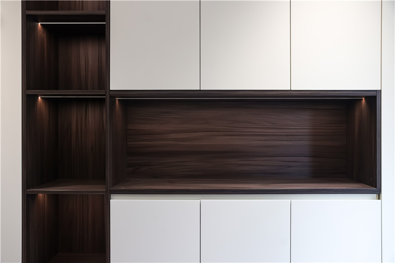 听风吟,赏叶落。靠近的阳台的空间里365WM完美体育SPORTS将其设计为一个开放休闲区,无论是想在这里办公阅读还是做手工、喝茶都是不错的选择。榆木柜体的纹理清晰可见,搭配纯净的白色通顶柜,带来一丝禅意,令人松弛神往。