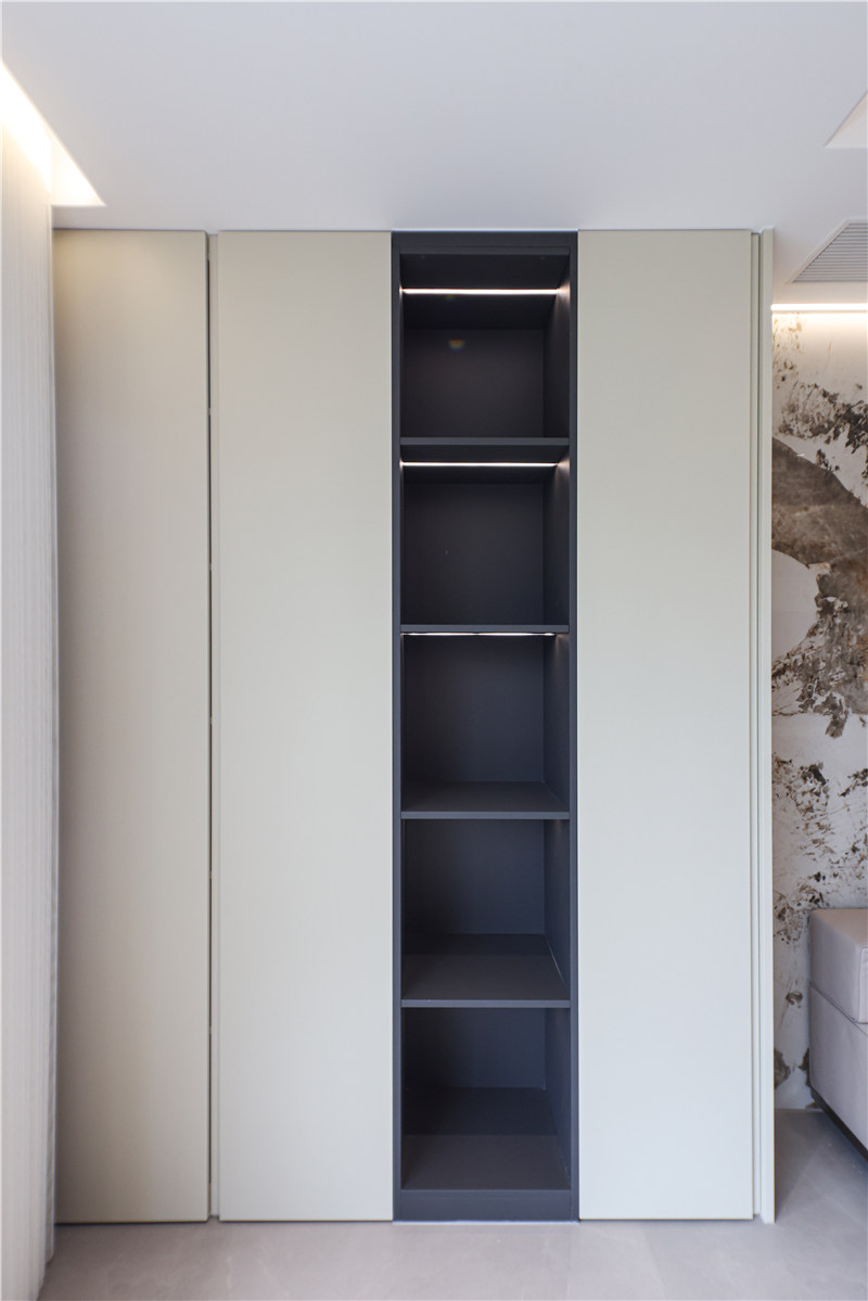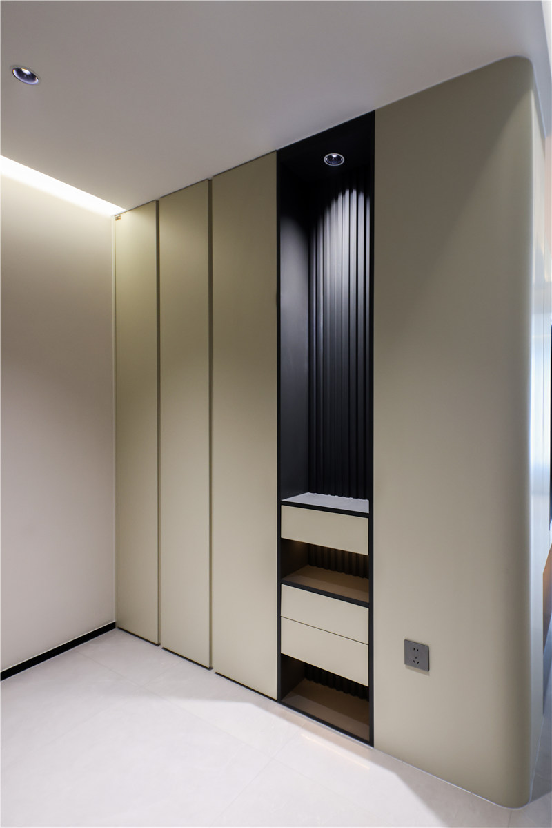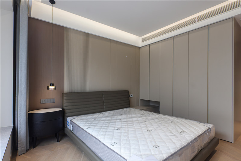 主卧进门一字型无拉手到顶柜延伸以床头柜,区别于对侧柱形柜,茶白色柔和雅致。