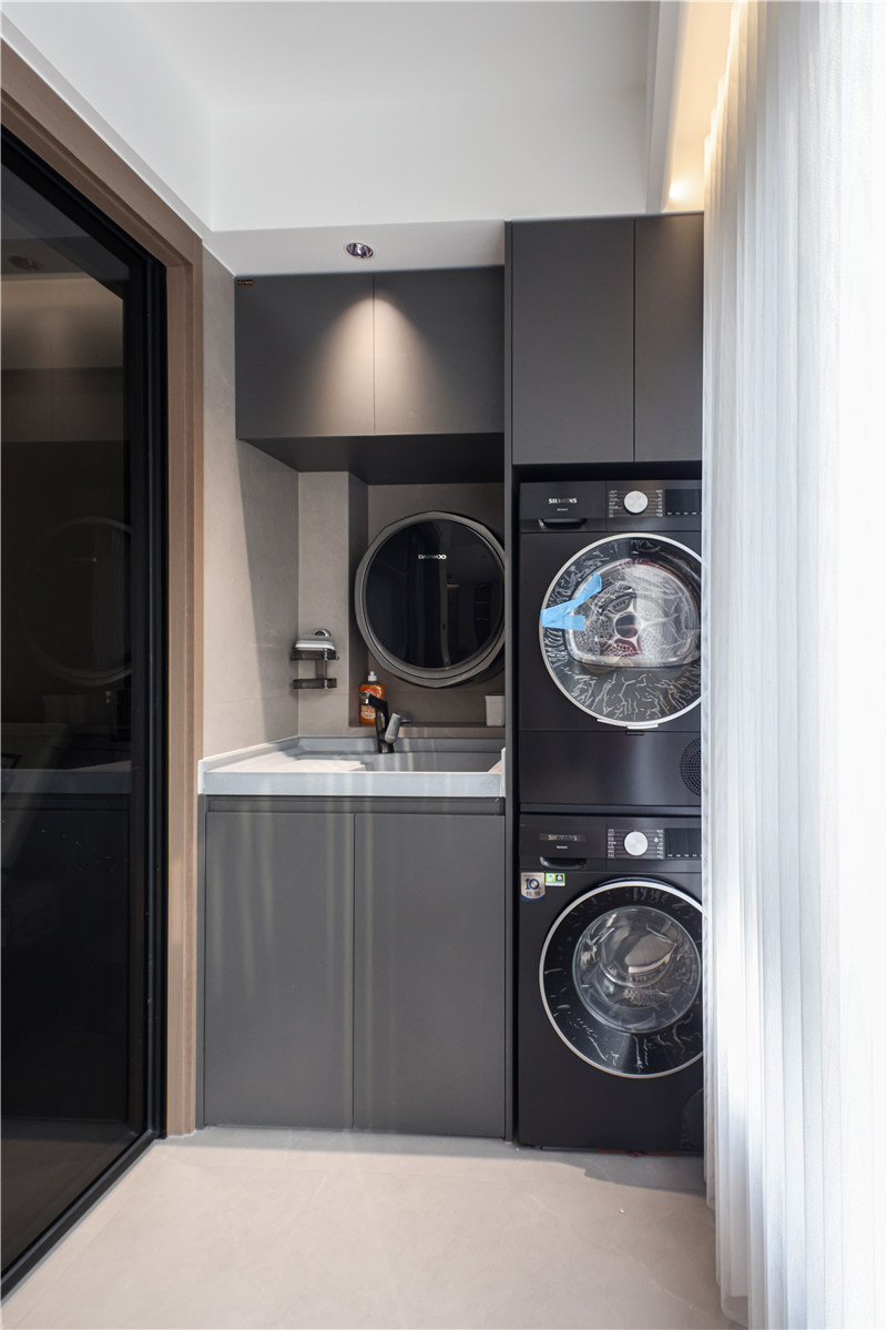 一侧阳台柜藏露结合,收纳物件的同时可进行DIY装饰;一侧做洗烘一体式洗漱台,可与男孩房共用,满满设计感。
