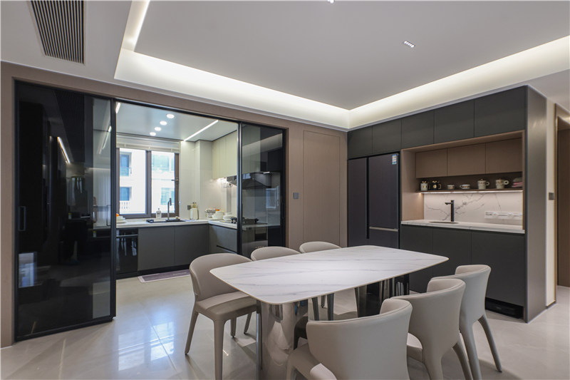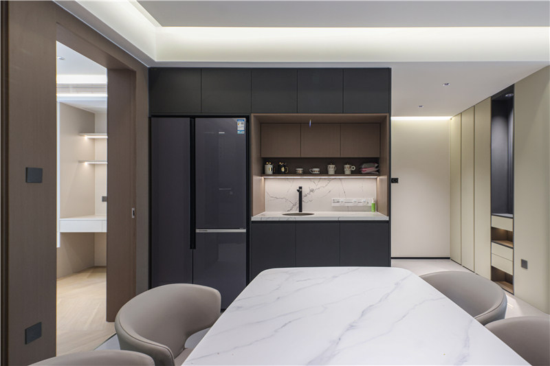 餐边柜整体无拉手设计,将冰箱一整个嵌入其中,视觉和谐统一;中部掏空预留清洗区,上方为餐具开放区,便捷实用;底部留空可放扫地机器人等电器。