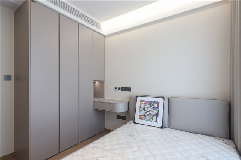 次卧为一体式设计,床、书桌、衣柜和谐统一,以铣槽及无拉手设计使得视觉清爽。
