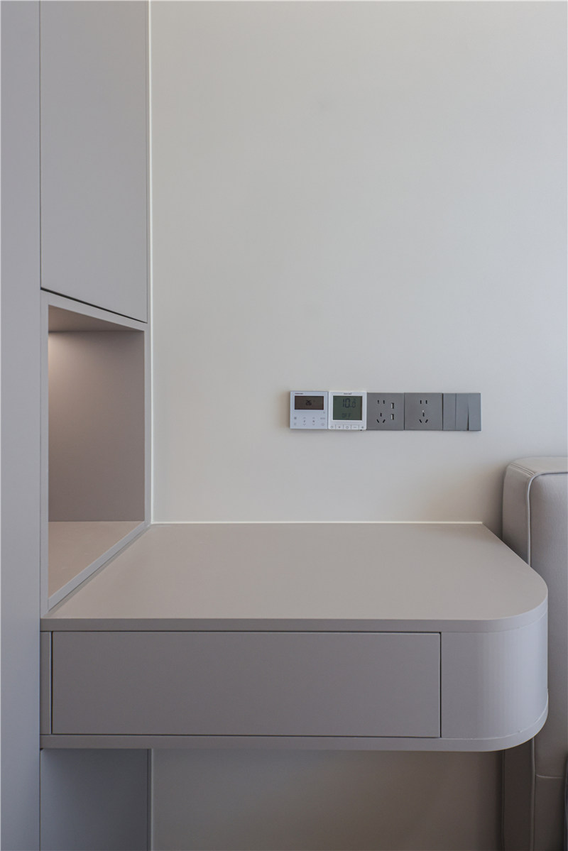 女孩房整体无主灯设计,打造出温馨柔和的氛围感;衣柜呼应于男孩房设计,兰迪米灰色低调且不失质感,床头柜上下方预留插座,方便实用。