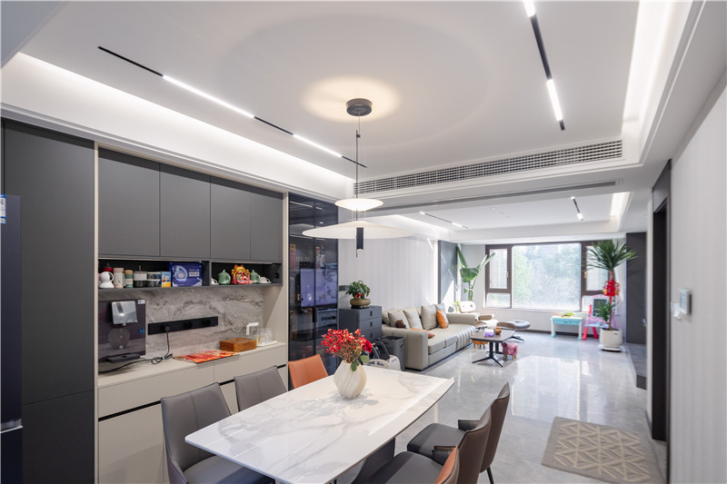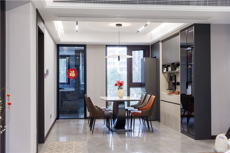 一侧冰箱嵌入立柜中,视觉上协调;一侧设置窄边黑框灰玻装饰柜嵌入灯带,是家里的风景线;餐边柜上下柜呼应、中部加入大理石纹背板,整体与餐桌椅配套。