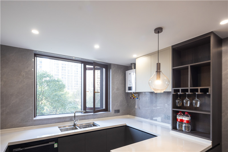 厨房整体小U型构造,贴墙而建有效利用家里的小空间,其大窗户有效保障室内的采光,主灯与辅灯结合式设计,使得烹饪时视觉效果好。