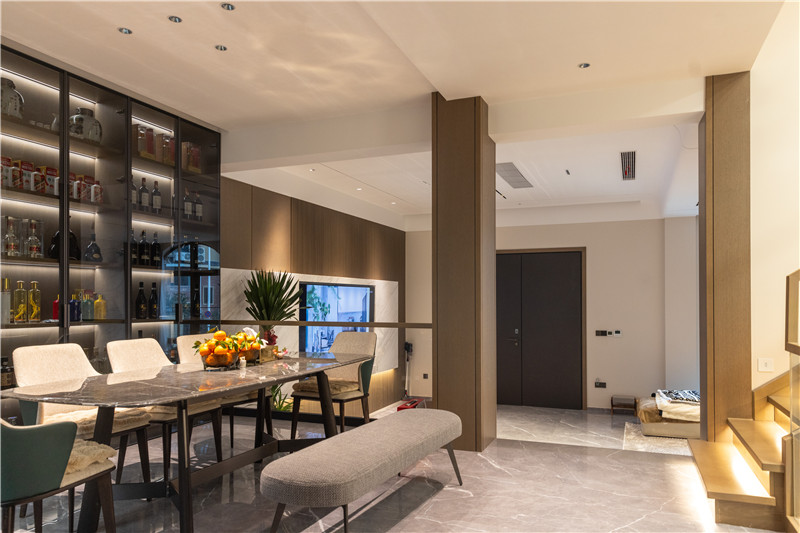 餐厅整体风格与客厅一致,暖黄灯光下尽显奢华氛围。餐边柜选用透明玻璃柜门,在内置灯带照射下,奢享优雅。