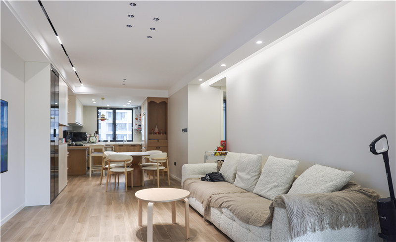 客厅区域以轻盈美学示人,避免芜杂色彩和沉重结构。两处背景墙均采用纯白墙面,通透布局叠加纯净色调,营造明净旷达的视觉感受。