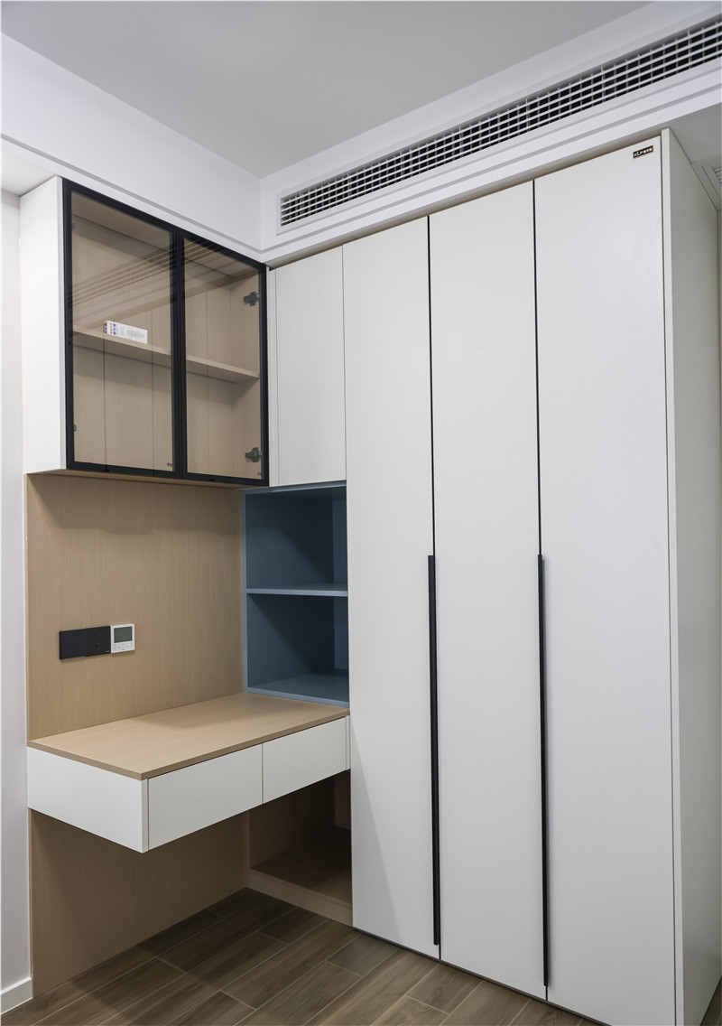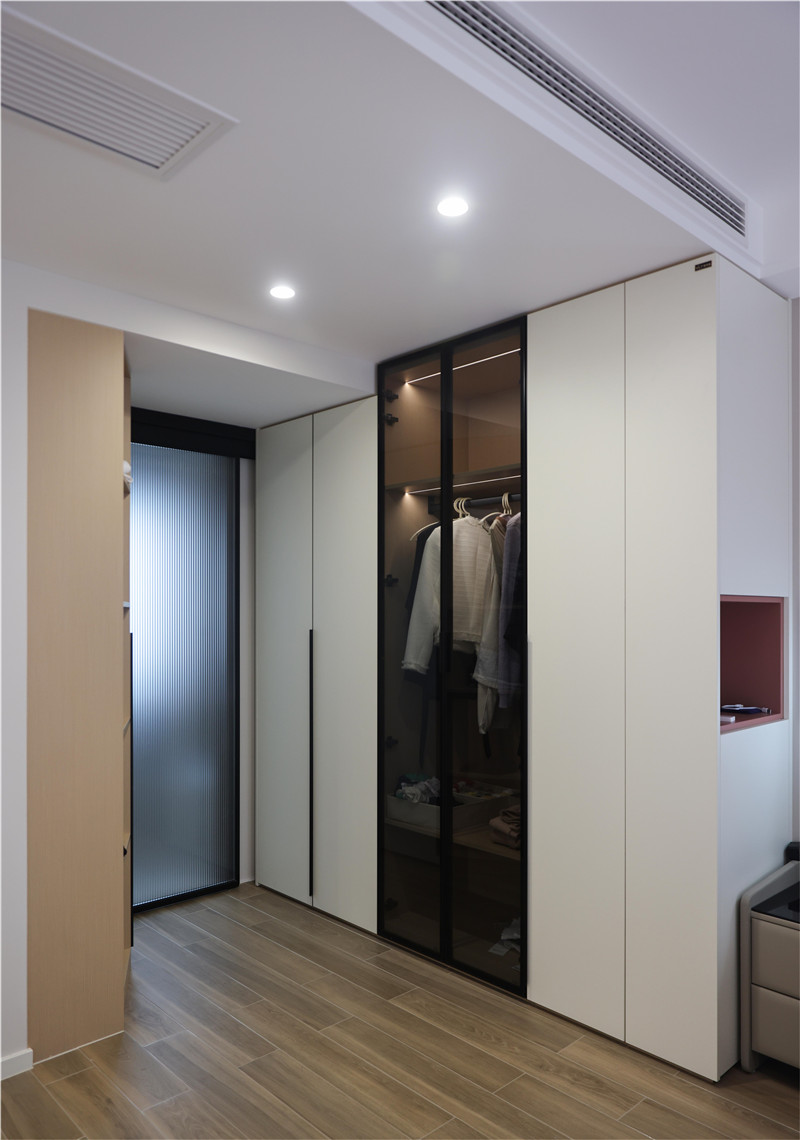 顶天立地式衣柜,藏露相间,拿捏陈列精髓,利落线条,加强纵线延伸感。封闭柜搭配玻璃展示柜和跳色开放格,从容展现了收纳空间的多面利用。