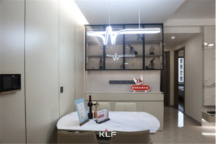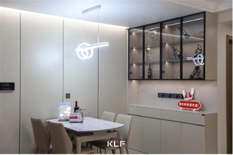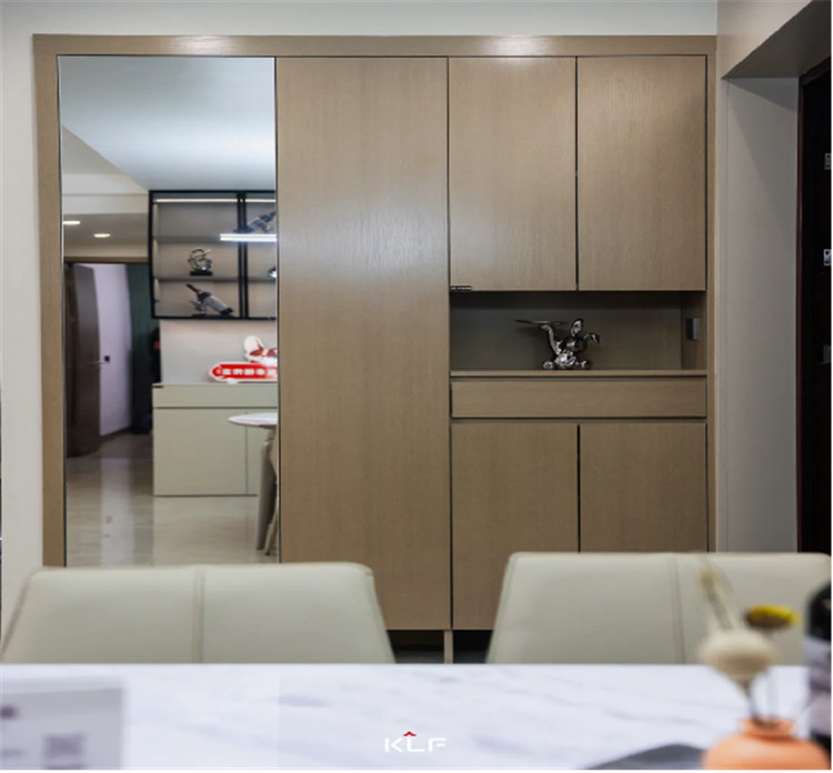 餐边柜与护墙板色调统一,显得空间和谐宽敞;玻璃吊柜内置灯带,既起到调节大面积茶白色带来的素净氛围,又很好呈现轻奢风强调的精致细节;免拉手设计简约实用,也减少日常磕碰。