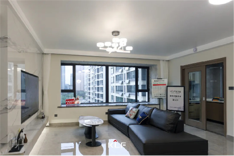 客厅恰到好处的轻奢感与整体空间的气氛相中和,避免因空间通透而觉冷清。黑色皮质的沙发搭配岩板茶几,彰显了客厅空间的时尚感。