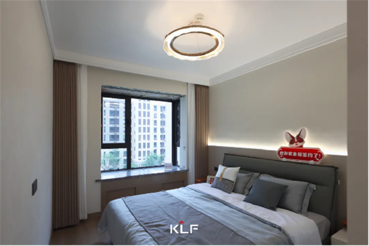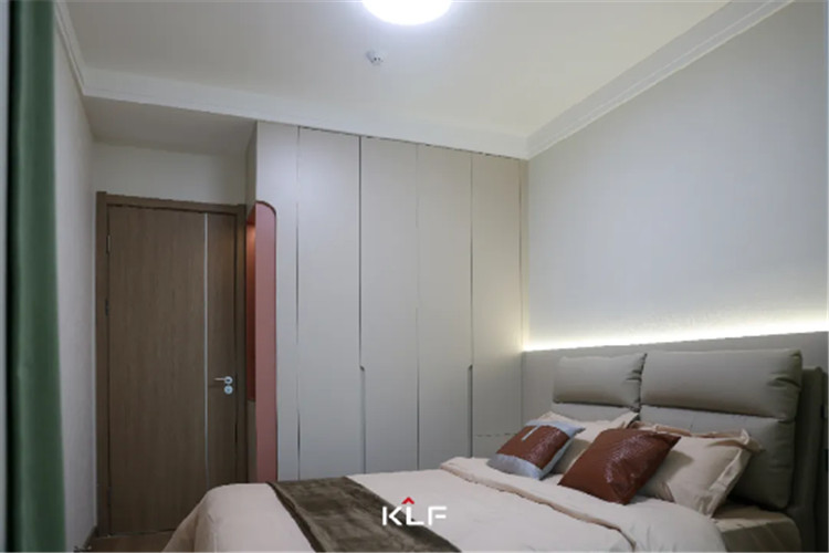 主卧一切以舒适主导,清新淡雅的床头背景墙营造出恬淡朴素的氛围,见光不见灯的氛围,让空间又多了一份温暖和舒适。