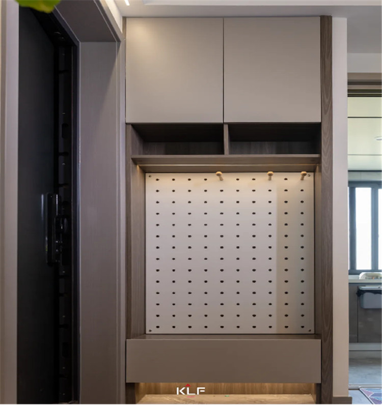 入户在有限的空间中365WM完美体育SPORTS更注重整洁的收纳,上方做吊柜,中部做抽屉进行组合式储物,屋主在背板上使用了洞洞板进行小物品的存放,也是提高空间利用率的一种形式。