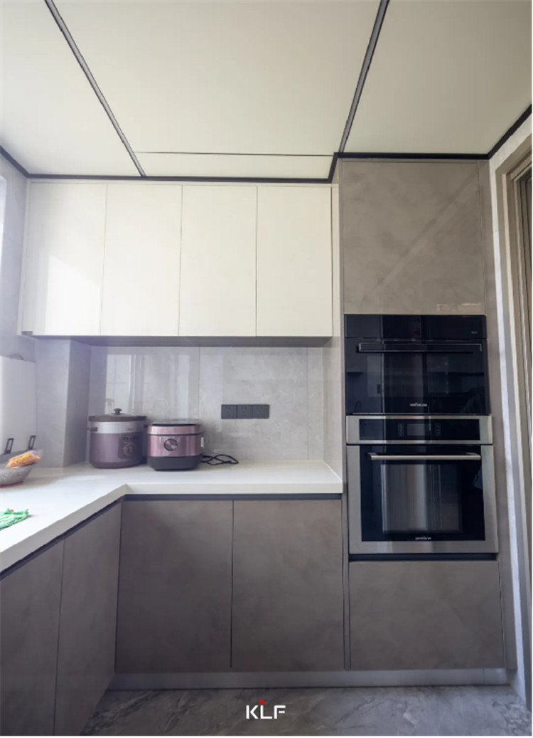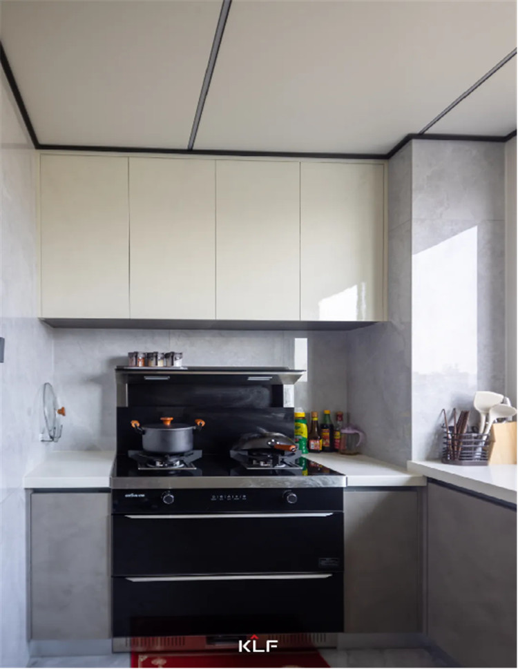 U型结构的厨房设计更注重物品的收纳,这种常规的吊柜+地柜的多重储物空间,正是能促成有序整洁的环境。吊柜采用伊丽莎白,亮面材质也很容易清洁。
