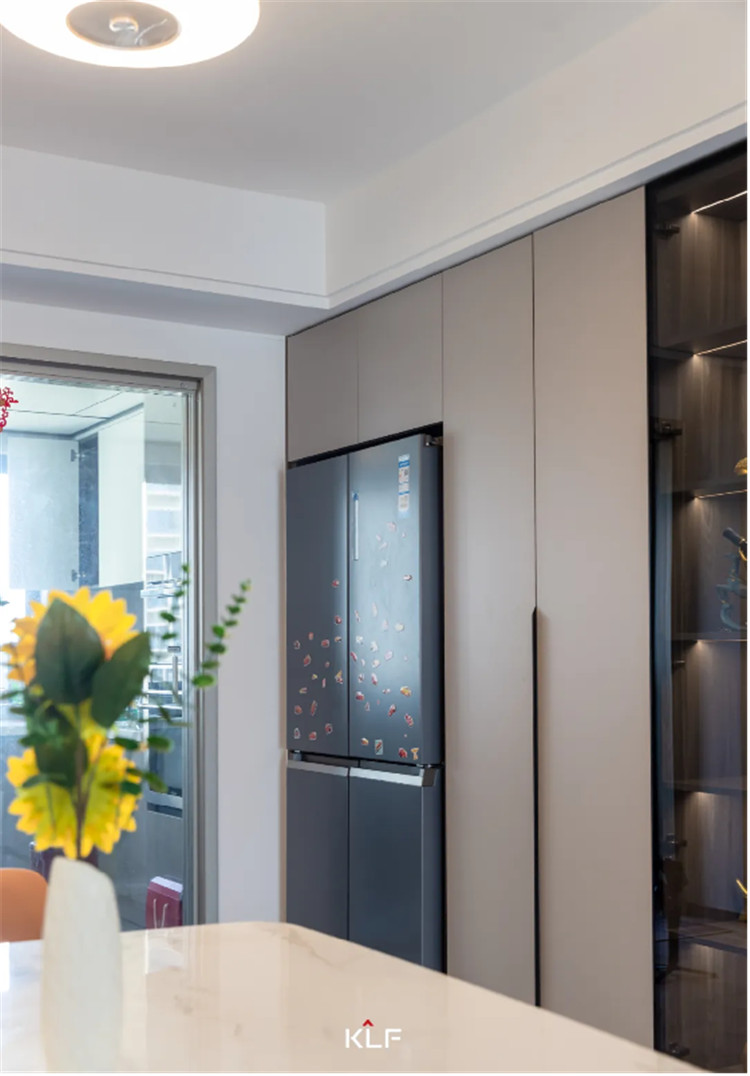 餐边柜留出冰箱位置做一体化设计,中部做半透茶玻用于展示藏酒与摆件,侧边柜中部掏空做置物台可以放置小家电和生活物品。整体餐边柜的设计功能性很高,在实用的同时注重各分区的比例,给人更精致的感觉。