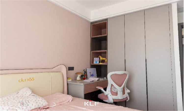 在女儿房的设计上,屋主以粉色调和蓝色调塑造了两间次卧。在次卧中,除了日常生活的睡眠区,在衣柜设计中加入了书桌的元素,让衣柜与书桌一体化设计,开放格可做书柜使用,整体和谐又节省空间。