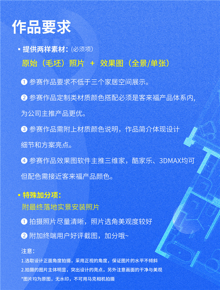 注:所有作品必须为本年度内设计师独立完成的方案,如有盗取、冒用他人作品的一经查实取消参赛资格,并通知当地经销商。