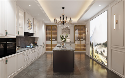 石英石台面的中岛台一方面起到了增加厨房操作台的功能,提高了生活的舒适度,另一方面可以充当餐桌,偶尔约上三五好友在这里喝酒或者聊天非常惬意。