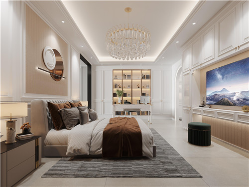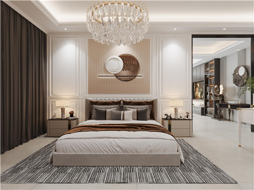 卧室灯具选用法式水晶吊灯为主灯,搭配床头射灯,流露出少有的轻奢唯美之感。床头背景墙面运用石膏线装饰出画框感,现代金属壁挂与之融合,是属于你的私享空间。整体设计有效增加空间柔和感,典雅而不失温馨,让你快速进入梦乡。