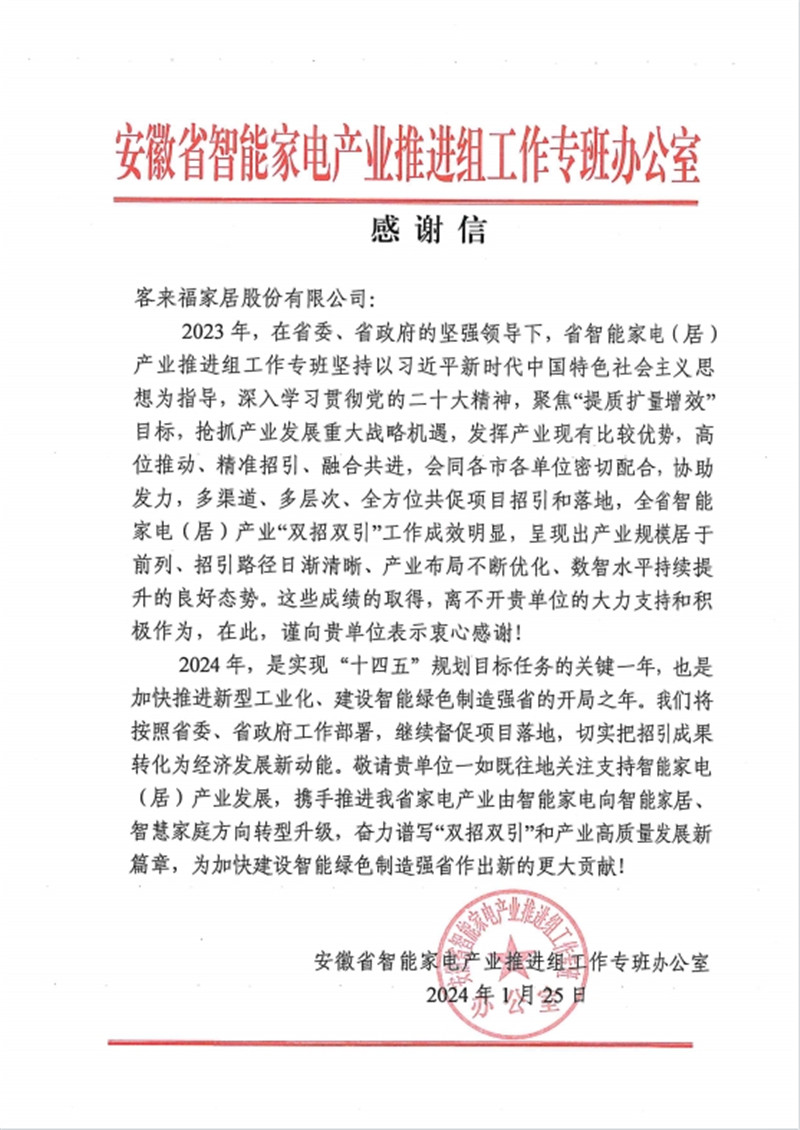 安徽省智能家电产业链推进组工作专班办公室感谢365WMSPORTS家居助力智能家电(居)产业发展