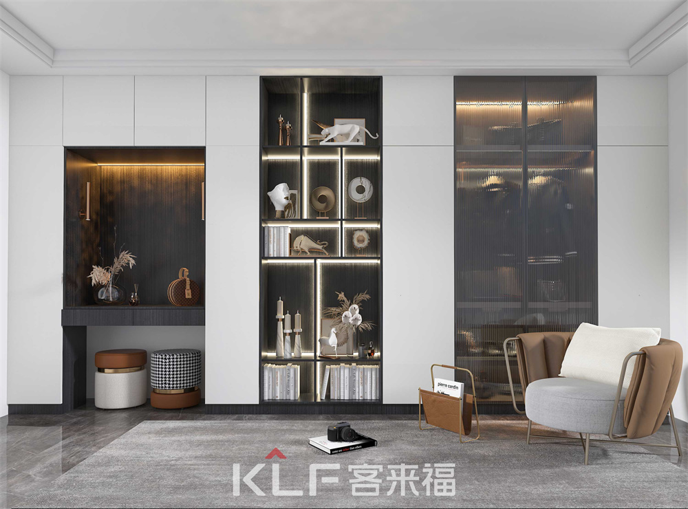 整体装饰的墙面,搭配明暗有别的置物架,让墙体看上去不再单调,独具空间韵味。