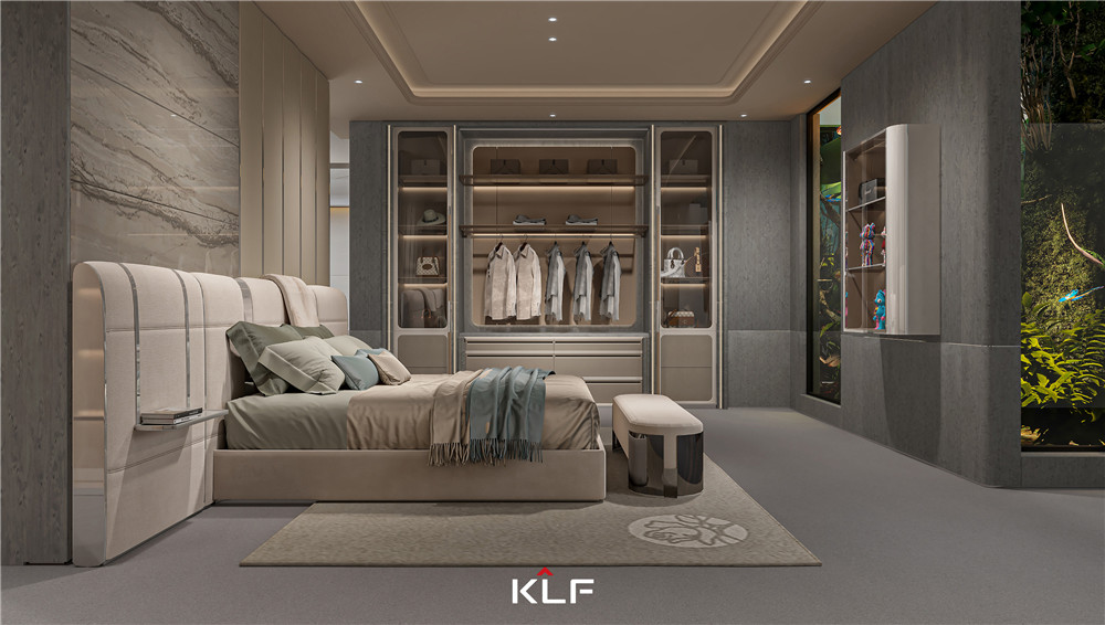 卧室背景墙以高级灰为主,金属线条装饰,营造出悠闲的空间氛围;衣柜背板采用了365WMSPORTSLOGO 标志实木雕刻板,颇具特色;两边配透明玻璃门对开门,方便换衣、打扮。