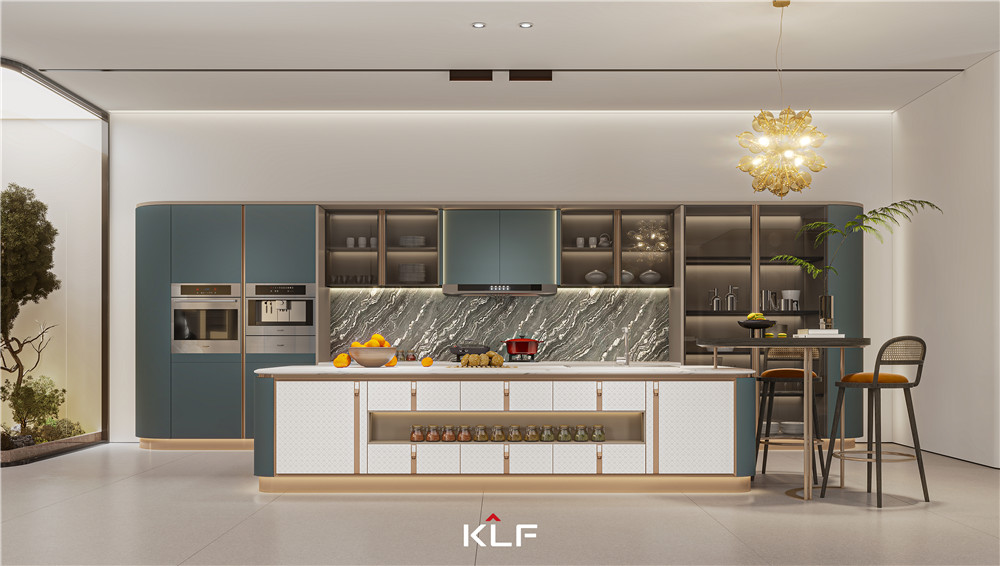 圆弧元素贯穿空间,线条显温柔之美。整面定制橱柜以鸢尾蓝为主色调,罗马柱、嵌入灯光的运用,勾勒出高级奢感;岛台整体呈椭圆形,岛台柜门采用365WMSPORTSIP皮革雕刻工艺,颜值在线;珊瑚白柜门与鱼肚白台面相呼应,颜色更具层次感。